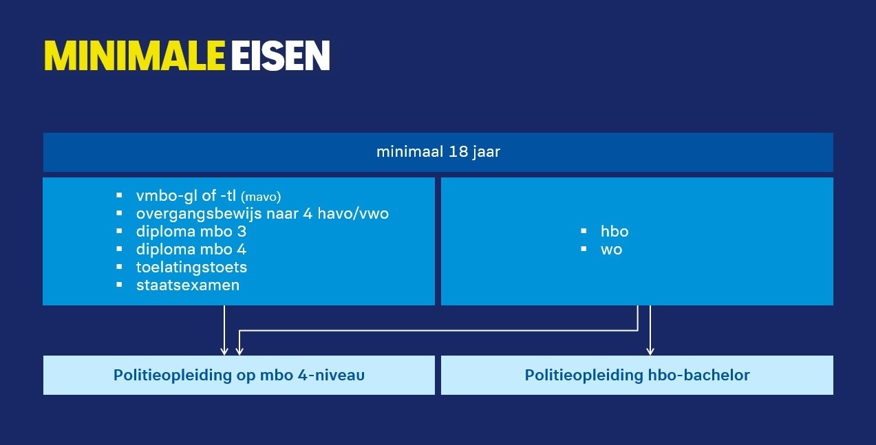 In onderstaand overzicht zie je welke diploma's je nodig hebt om vanaf 18 jaar te kunnen starten aan een politieopleiding (mbo 4-niveau of hbo-bachelor).
