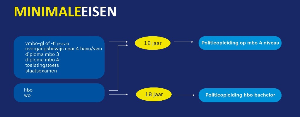 Wil jij bij de politie werken? In onderstaand overzicht zie je welke diploma's je nodig hebt om vanaf 18 jaar te kunnen starten aan een van de twee opleidingen (mbo-4 of hbo-bachelor) aan de Politieacademie.