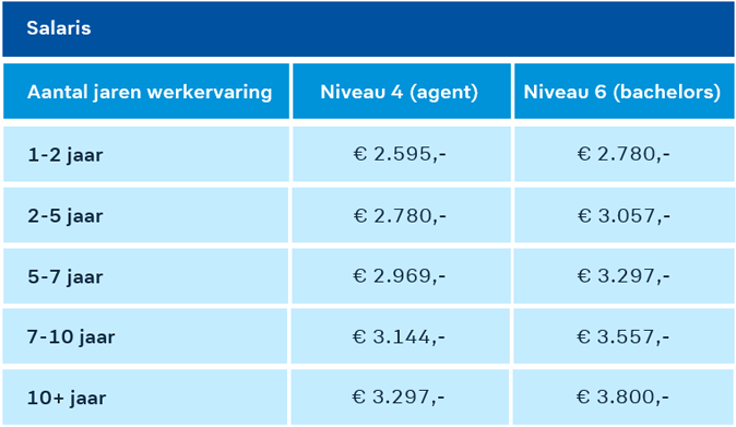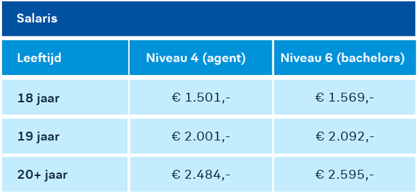 - Je startsalaris: Dit is het bedrag waarmee je de opleiding begint. De inschaling wordt bepaald door de opleiding die je gaat volgen (agent - niveau 4, of bachelor - niveau 6) en hoeveel werkervaring je hebt.